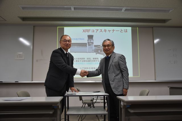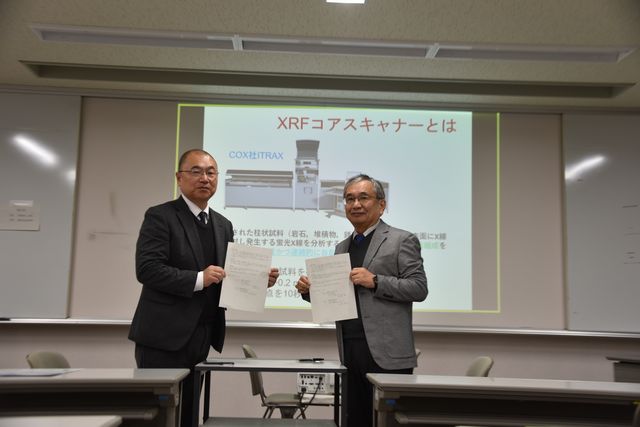 2日目のシンポジウム「XRFコアスキャナーを用いた最近の研究」では、齋藤文紀副学長から本学を代表して挨拶(センターは改組後10年目を迎える/ITRAXは本格的な初の分析機器の導入である/ITRAXの活用が今後のセンターの基軸発展につながると思う)があり、そのあと日本で3台目の機器となる「コアスキャナーITRAX」についての研究成果や応用の可能性が発表されました。シンポジウム後には、日本で初めて「コアスキャナーITRAX」を導入された高知大海洋コア国際研究所と当センターの部局間協定の調印式が行われ、佐野有司所長と矢島啓センター長が臨み、無事調印内容が確定されました。