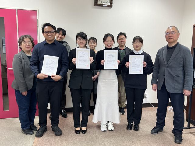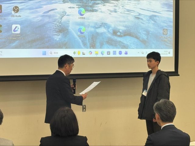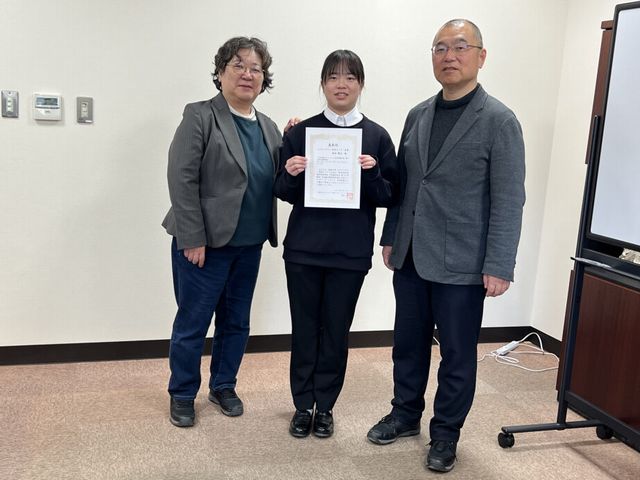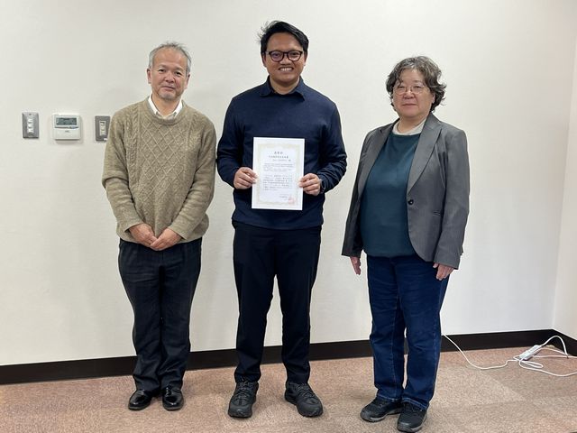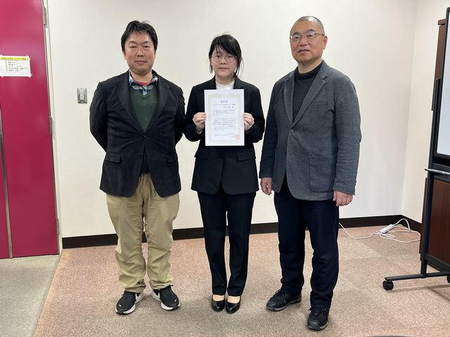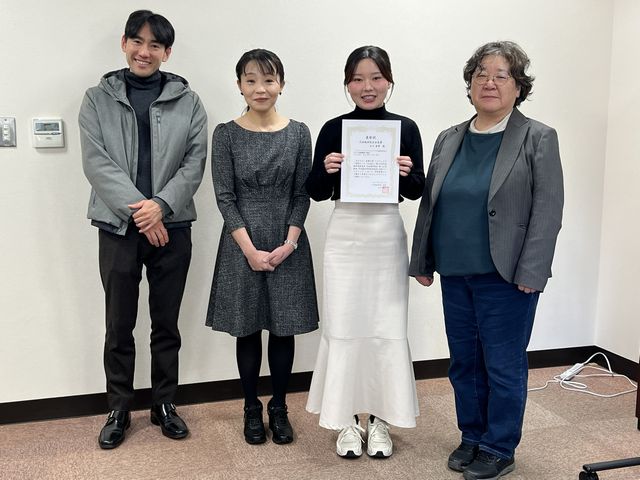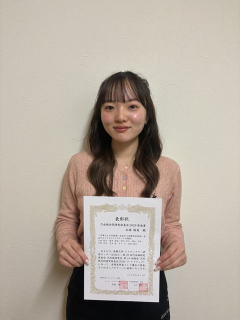 受賞コメント:本日はこのような賞をいただき、大変光栄に思っております。また、山口先生をはじめ、多くの方々にご指導、ご協力いただいたお陰であると実感しております。春からは教員として働きますが、学んだことを活かし、次は私が未来の人材を育て、環境教育の面で貢献していきたいと思っています。